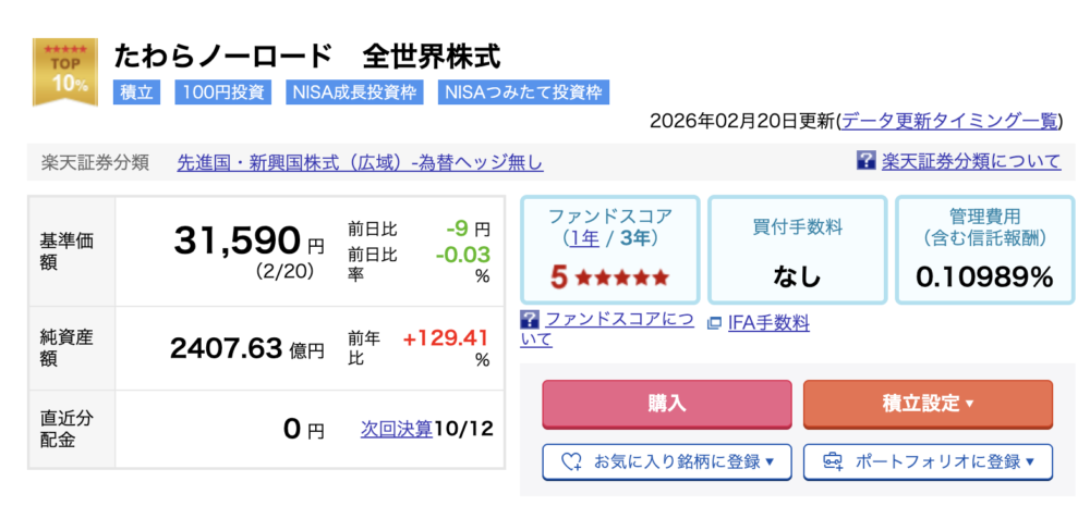 インデックスファンドは、「たわらノーロード 全世界株式」を選びました。