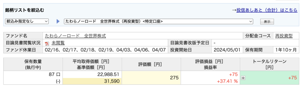 ・たわらノーロード全世界株式(インデックス):+37.41%(+75円)