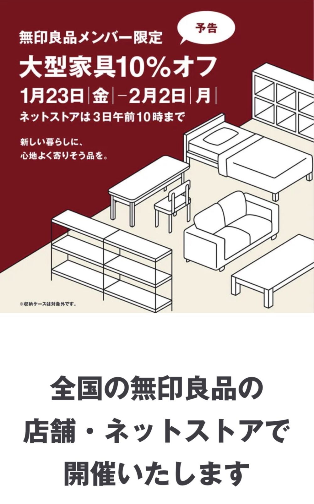 無印良品がメンバー限定で、2026年1月23日(金)〜2月2日(月)まで大型家具10%オフを開催するそうです。