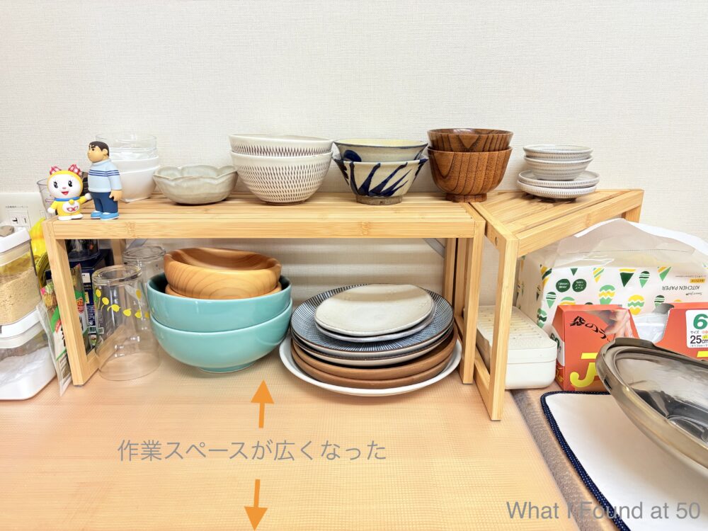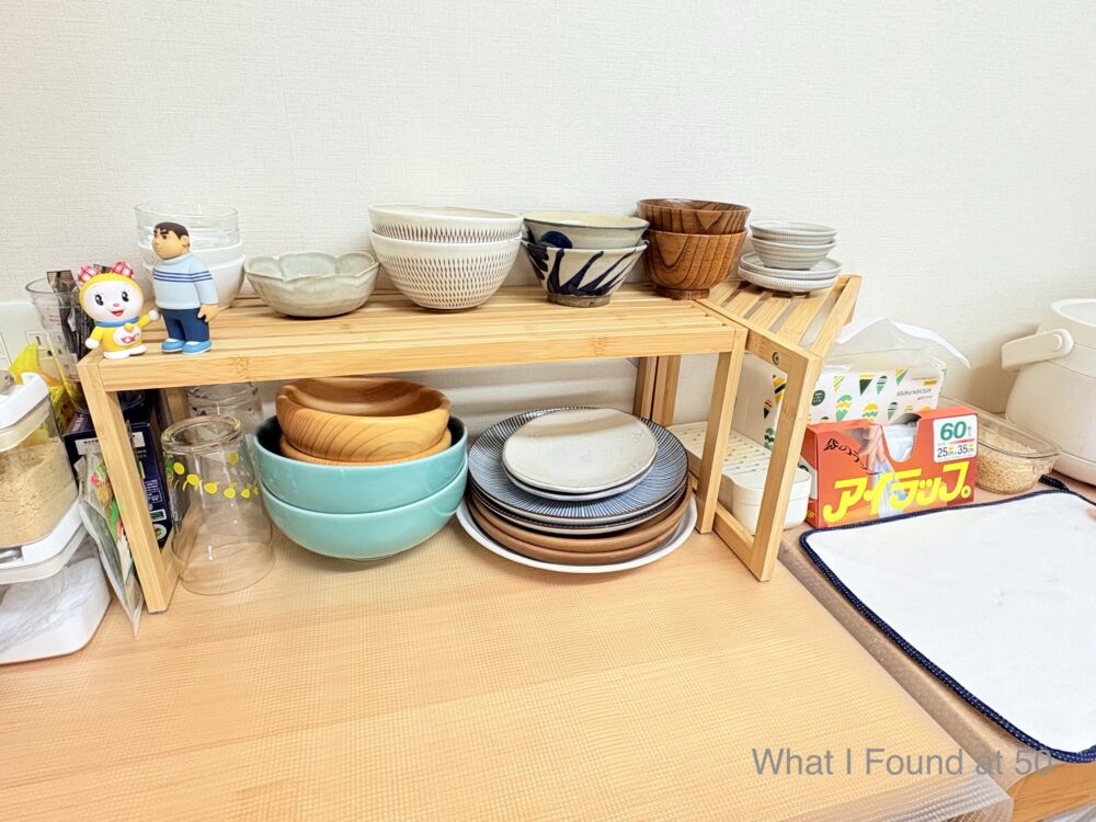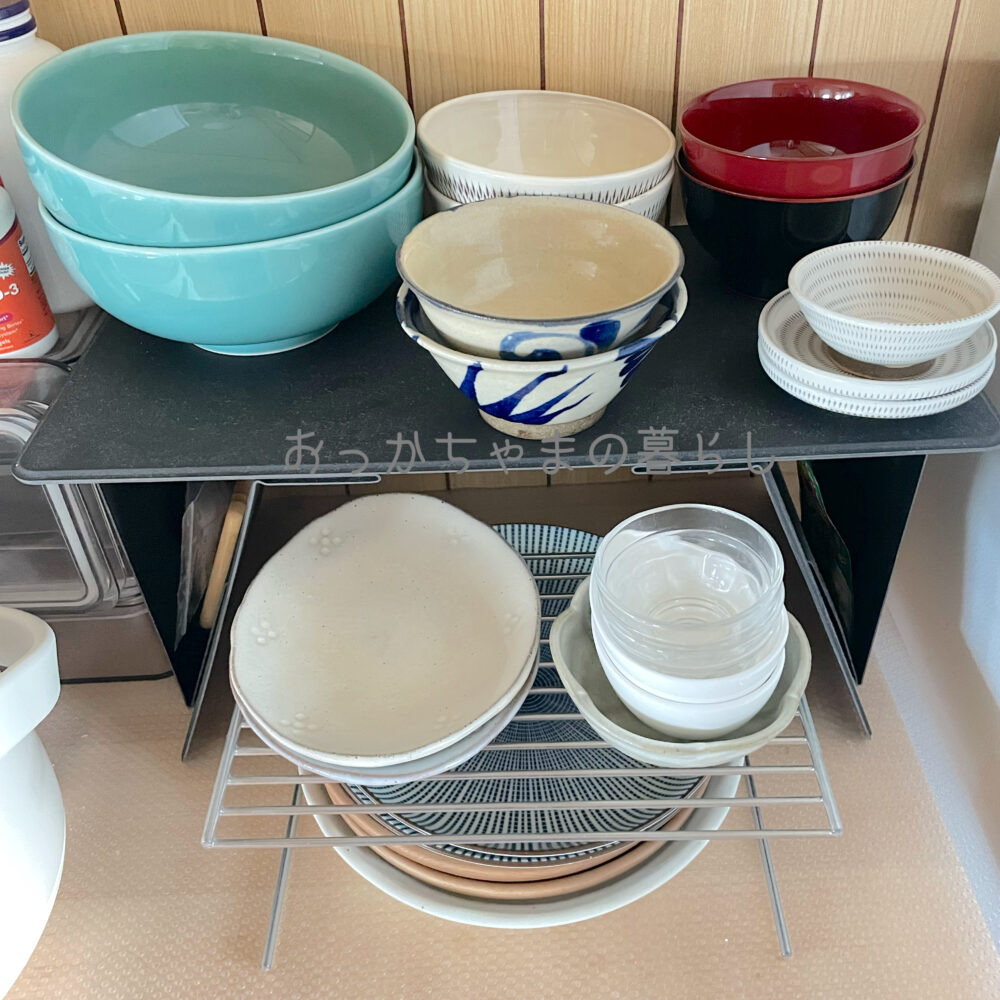 以前の食器置きは、ノートパソコン用のスタンドを使っていたのですが、色が合わないのと、足元がぐらつくと倒れてしまうかもしれないということで、今回交換しました。